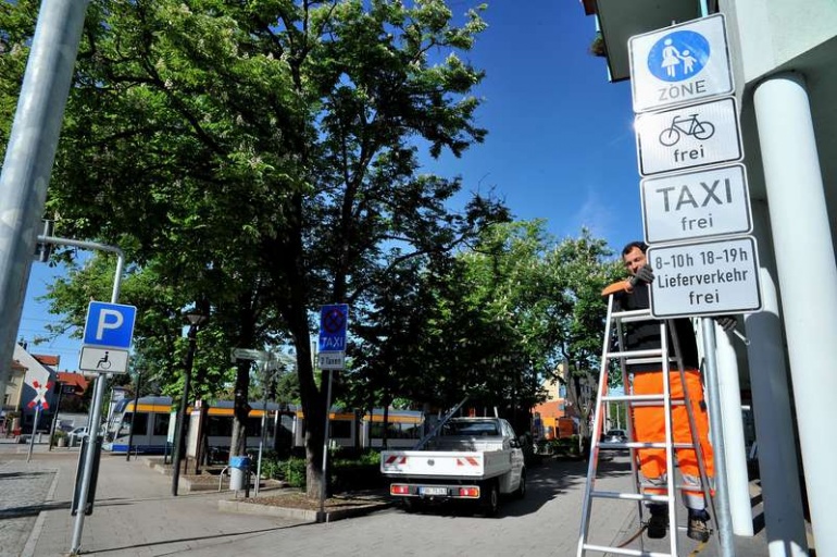 Nach mehr als drei Jahren politischer Diskussion und der endgültigen Widmungsentscheidung des Stadtrates im März dieses Jahres ist der Straßenzug Sonnenpassage als Fußgängerzone ausgeschildert worden. Fortan ist das Einfahren über den dort befindlichen Fußgängerüberweg auf den schmalen Straßenzug zwischen Gebäudezeile und Straßenbahnhaltestelle bis auf drei Ausnahmen verboten. Weitere einfahren dürfen gemäß abschließender Beschilderung Fahrräder und Taxi, die Anlieferung ist - allerdings zeitlich begrenzt - möglich. Auch das Befahren ist Parkplatzes hinter der Sonnenpassage bleibt erlaubt - über die Weststraße und die Straße Am Stadtpark finden die Autos ihren Weg. Das Parken in der Sonnenpassage ist aufgrund der Fußgängerzone verboten.